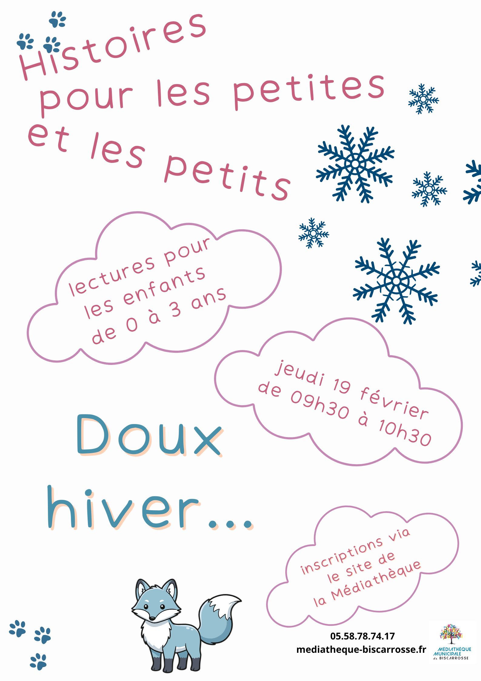 • Un jeudi de 9h30 à 10h30 une fois tous les deux mois : 19 février, "Doux hiver..."